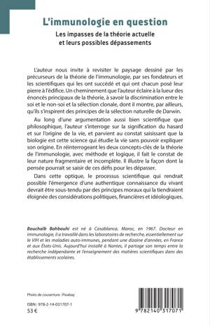 L'auteur nous invite à revisiter le paysage dessiné par les précurseurs de la théorie de l'immunologie, par ses fondateurs et les scientifiques qui les ont succédé et qui ont chacun posé leur pierre à l'édifice. Un cheminement que l'auteur éclaire à la lueur des énoncés principaux de la théorie, à savoir la discrimination entre le soi et le non-soi et la sélection clonale, dont il montre, par ailleurs, qu'ils s'inspirent des principes de la sélection naturelle de Darwin. Au long d'une argumentation aussi bien scientifique que philosophique, l'auteur s'interroge sur la signification du hasard et sur l'origine de la vie, et parvient au constat saisissant que la biologie est cette science qui étudie la vie sans pouvoir expliquer son origine. En réinterrogeant les deux concepts-clés de la théorie de l'immunologie, avec méthode et logique, il fait le constat de leur nature fragmentaire et incomplète. Il illustre la façon dont la pensée pourrait se saisir de ces défis pour les dépasser. Dans cette optique, le processus scientifique qui rendrait possible l'émergence d'une authentique connaissance du vivant devrait être sous-tendu par des principes moraux qui la tiendraient éloignée des considérations politiques, financières et idéologiques.