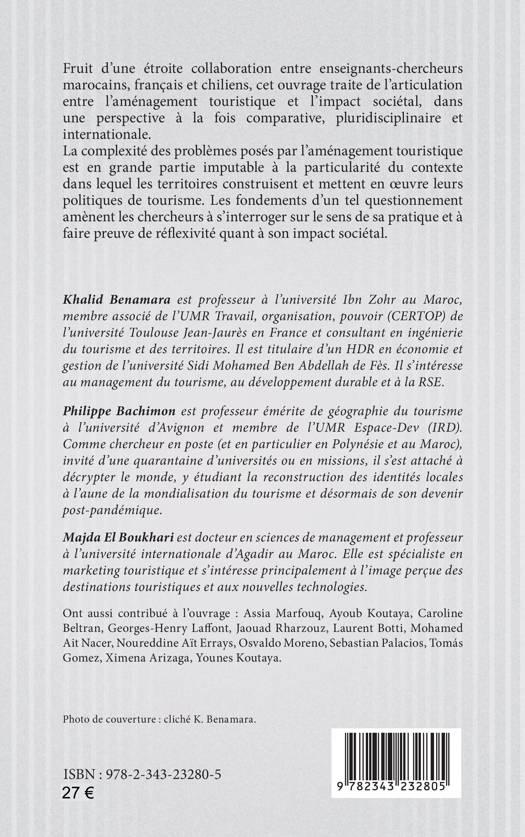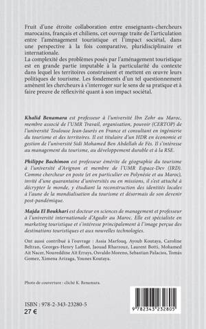 Fruit d'une étroite collaboration entre enseignants-chercheurs marocains, français et chiliens, cet ouvrage traite de l'articulation entre l'aménagement touristique et l'impact sociétal, dans une perspective à la fois comparative, pluridisciplinaire et internationale. La complexité des problèmes posés par l'aménagement touristique est en grande partie imputable à la particularité du contexte dans lequel les territoires construisent et mettent en oeuvre leurs politiques de tourisme. Les fondements d'un tel questionnement amènent les chercheurs à s'interroger sur le sens de sa pratique et à faire preuve de ré¬flexivité quant à son impact sociétal.