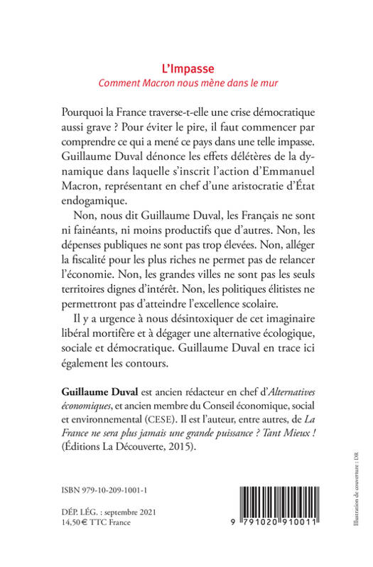 Pourquoi la France traverse-t-elle une crise démocratique aussi grave ? Pour éviter le pire, il faut commencer par comprendre ce qui a mené ce pays dans une telle impasse. Guillaume Duval dénonce les effets délétères de la dynamique de long terme dans laquelle s'inscrit l'action d'Emmanuel Macron, représentant en chef d'une aristocratie d'État endogamique. Non, nous dit Guillaume Duval, les Français ne sont ni fainéants, ni moins productifs que d'autres. Non, les dépenses publiques ne sont pas trop élevées. Non, alléger la fiscalité pour les plus riches ne permet pas de relancer l'économie. Non, les grandes villes ne sont pas les seuls territoires dignes d'intérêt. Non, les politiques élitistes ne permettront pas d'atteindre l'excellence scolaire. Il y a urgence à nous désintoxiquer de cet imaginaire libéral mortifère et à dégager une alternative écologique, sociale et démocratique crédible. Guillaume Duval en trace ici également les contours.