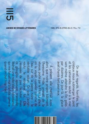 " On avait regardé, horrifiés, les cristaux mous submerger le pont et les camarades sauter à la mer sans même attendre la fin, gelés par dizaines. Ce jour-là, la glace avait chanté fort pour eux. À présent, elle chantait aussi, alors que notre propre bâtiment, l’Awesome Pride, prenait de la vitesse, porté par le Flux. La glace, on la voyait ruisseler comme de l’eau sur de la pierre noire – le véritable océan. Ce que j’aurais voulu le retrouver, lui. Elle, j’essayais de pas l’écouter, mais ce glouglou apaisant, tranquille, libérait une note bleue, obsédante, qui me faisait mal à la tête, comme quand on boit trop froid."