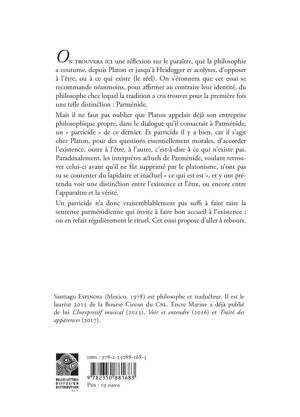 On trouvera ici une reflexion sur le paraitre, que la philosophie a coutume, depuis Platon et jusqu'a Heidegger et acolytes, d'opposer a l'etre, ou a ce qui existe (le reel). On s'etonnera que cet essai se recommande neanmoins, pour affirmer au contraire leur identite, du philosophe chez lequel la tradition a cru trouver pour la premiere fois une telle distinction: Parmenide.Mais il ne faut pas oublier que Platon appelait deja son entreprise philosophique propre, dans le dialogue qu'il consacrait a Parmenide, un parricide de ce dernier. Et parricide il y a bien, car il s'agit chez Platon, pour des questions essentiellement morales, d'accorder l'existence, outre a l'etre, a l'autre, c'est-a-dire a ce qui n'existe pas. Paradoxalement, les interpretes actuels de Parmenide, voulant retrouver celui-ci avant qu'il ne fut supprime par le platonisme, n'ont pas su se contenter du lapidaire et inactuel ce qui est est , et y ont pretendu voir une distinction entre l'existence et l'etre, ou encore entre l'apparaitre et la verite.Un parricide n'a donc vraisemblablement pas suffi a faire taire la sentence parmenidienne qui invite a faire bon accueil a l'existence; on en refait regulierement le rituel. Cet essai propose d'aller a rebours.