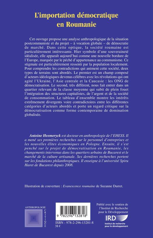 Voici une analyse anthropologique de la situation postcommuniste et du projet de démocratie de marché. Dans cette optique, la société roumaine est particulièrement intéressante. Pour comprendre les contradictions qui l'animent, deux types de terrains sont ici abordés : celui des ONG de démocratisation, et celui de la classe moyenne. Le tableau d'ensemble montre des intérêts extrêmement divergents et porte un regard critique sur la démocratisation comme forme contemporaine de domination globalisée.