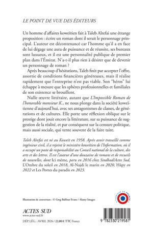 Un homme d'affaires koweïtien fait à Taleb Alrefai une étrange proposition : écrire un roman dont il serait le personnage principal. L'auteur est décontenancé car l'homme qu'il a en face de lui dégage une aura de puissance et de réussite, ses bureaux sont luxueux, et il est une personnalité publique de premier plan dans l'Émirat. N'a-t-il plus rien à désirer que de devenir un personnage de roman ? Après beaucoup d'hésitations, Taleb finit par accepter l'offre, assortie de conditions financières généreuses, mais il réalise rapidement que l'entreprise n'est pas viable. Son "héros" lui échappe à mesure que les sphères professionnelles et familiales de son existence se brouillent. Nulle oeuvre littéraire, autant que L'Impossible Roman de l'honorable monsieur K., ne nous plonge dans la société koweïtienne d'aujourd'hui, avec ses antagonismes de classes, de générations et de cultures. Elle porte une réflexion oblique sur le prestige dont jouit encore la littérature, sur sa puissance de suggestion de la réalité, et par conséquent sur la censure politique, mais aussi sociale, qui tente souvent de la faire taire.