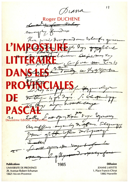 On avait pu, pendant un an (23 janvier 1656-23 janvier 1657), se procurer dix-sept brefs libelles, lettres adressées à un provincial par un de ses amis parisiens. Au début de 1657, on les trouva réunis en un seul volume dans un recueil factice composé à partir des tirages au format original in-quarto. Au milieu de l'année, paraîtra une nouvelle édition corrigée, de format in-12, complétée en cours d'impression par une dix-huitième lettre, datée du 24 mars. En tête de ces recueils, on lisait : Les Provinciales ou les lettres écrites par Louis de Montalte à un Provincial de ses amis et aux RR. PP. Jésuites, sur le sujet de la morale et de la politique de ces Pères. Avec eux seulement apparaissait le pseudonyme choisi par Pascal pour recouvrir un anonymat que personne n'avait encore percé : les "Petites Lettres" avaient désormais un auteur. Elles étaient précédées d'un Avertissement, probablement dû à Pierre Nicole. Il y résumait le contenu et l'esprit du volume. Il y donnait aussi des précisions sur son titre : "Voilà les principales matières qui sont traitées dans ces Lettres qui ont été appelées Provinciales, parce que les premières ayant été adressées, sans aucun nom, à une personne de la campagne, l'imprimeur les publia sous ce titre : Lettres écrites à un Provincial par un de ses amis". Nicole y affirmait son impuissance à préciser qui les avait écrites : "je voudrais bien pouvoir dire maintenant quelque chose de celui duquel nous les tenons, mais le peu de connaissance qu'on en a m'en ôte le moyen, car on ne sait de lui que ce qu'il en a voulu dire. Il s'est fait connaître depuis peu par le nom de Louis de Montalte. Tout ce qu'on sait de lui est qu'il a déclaré plusieurs fois qu'il n'est ni prêtre ni docteur." Affirmation évidemment mensongère. Le rédacteur de l'Avertissement venait, pendant un an, de collaborer étroitement avec Pascal pour lui fournir la documentation dont il avait besoin et vérifier l'exactitude théologique de ce qu'il avait écrit. Grave imposture si l'on se place du point de vue moral ; déclaration nécessaire si l'on considère qu'il s'agit de fiction littéraire. Le mensonge de Nicole appartient aux conditions de lecture des Provinciales. Il fait partie des belles "inventions" d'une œuvre qui a eu l'art de quitter la théologie pour la littérature à l'insu de ses premiers lecteurs et de presque tous ceux qui les ont suivis.