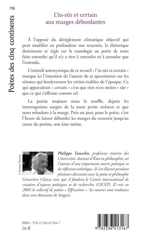 À l'opposé du dérèglement climatique objectif qui peut modifier en profondeur nos ressentis, la rhétorique dominante se règle sur la tautologie au point de nous faire entendre qu'il n'y a rien à entendre ni à attendre que l'entendu. L'intitulé antonymique de ce recueil « l'in-sûr et certain » marque ici l'intention de l'auteur de se questionner sur les séismes qui bouleversent les vérités établies de l'époque. Ce qui apparaîtrait « certain » c'est que rien n'est moins « sûr » que ce qui s'affirme comme tel. La poésie toujours nous le souffle, depuis les interrogations surgies de la toute petite enfance et que nous refoulons à la marge. Puis un jour, pour le poète, c'est l'heure de laisser déborder les marges du ressentir jusqu'au cœur du poème, son âme même.