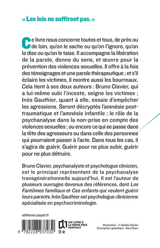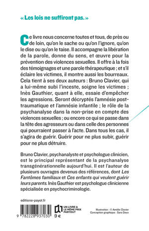 Ce livre nous concerne toutes et tous, de près ou de loin, qu'on le sache ou qu'on l'ignore, qu'on le dise ou qu'on le taise. Il accompagne la libération de la parole, donne du sens, et oeuvre pour la prévention des violences sexuelles. Il offre à la fois des témoignages et une parole thérapeutique ; et s'il éclaire les victimes, il montre aussi les bourreaux. Cela tient à ses deux auteurs : Bruno Clavier, qui a lui-même subi l'inceste, soigne les victimes ; Inès Gauthier, quant à elle, essaie d'empêcher les agressions. Seront décryptés l'amnésie post-traumatique et l'amnésie infantile ; le rôle de la psychanalyse dans la non-prise en compte des violences sexuelles ; ou encore ce qui se passe dans la tête des agresseurs ou dans celle des personnes qui pourraient passer à l'acte. Dans tous les cas, il s'agira de guérir. Guérir pour ne plus subir, guérir pour ne plus détruire.