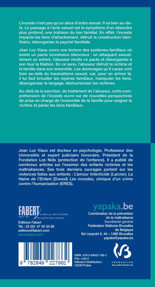 L’inceste n’est pas qu’un abus d’ordre sexuel. Il va bien au-delà. Le passage à l’acte sexuel est le symptôme d’un désordre plus profond, une trahison du lien familial. En effet, l’inceste impacte les liens d’attachement, détruit la construction identitaire, désorganise la psyché familiale. Jean Luc Viaux ouvre une lecture des systèmes familiaux où existe un pacte incestueux silencieux : en attaquant sexuellement un enfant, l’abuseur révèle ce pacte et désorganise à son tour la filiation. En ce sens, l’abuseur détruit la victime et la famille dans son ensemble. Les dommages qu’il cause vont bien au-delà du traumatisme sexuel, car pour en arriver là il lui faut brouiller les repères familiaux, manipuler les liens, désorganiser le langage, déshumaniser les victimes. Au-delà de la sanction, du traitement de l’abuseur, cette compréhension de l’inceste ouvre sur de nouvelles perspectives de prise en charge de l’ensemble de la famille pour soigner la victime et parler les liens familiaux.