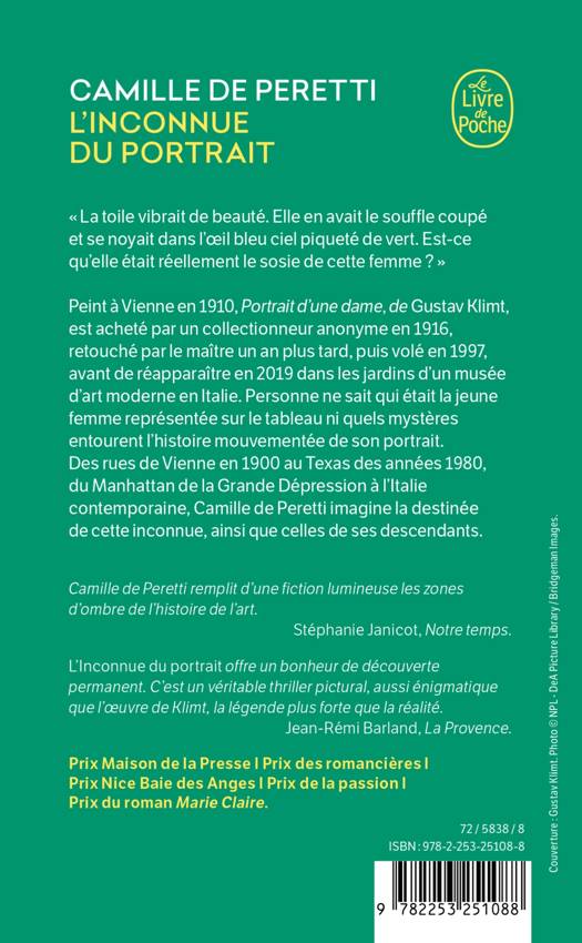 Peint à Vienne en 1910, le tableau de Gustav Klimt, Portrait d’une dame, est acheté par un collectionneur anonyme en 1916, retouché par le maître un an plus tard, volé en 1997 avant de réapparaître en 2019 dans les jardins d’un musée d’art moderne en Italie. Personne ne sait qui était la jeune femme représentée dans le tableau ni quels mystères entourent l’histoire mouvementée de son portrait. Des rues de Vienne en 1900 au Texas des années 1980, du Manhattan de la Grande Dépression à l’Italie contemporaine, Camille de Peretti imagine la destinée de cette jeune femme, ainsi que celles de ses descendants.