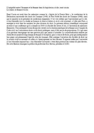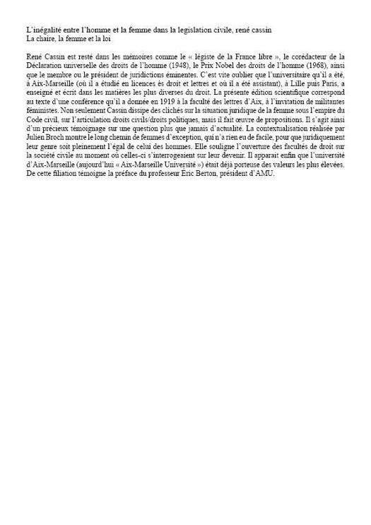 René Cassin est resté dans les mémoires comme le « légiste de la France libre », le corédacteur de la Déclaration universelle des droits de l’homme (1948), le Prix Nobel des droits de l’homme (1968), ainsi que le membre ou le président de juridictions éminentes. C’est vite oublier que l’universitaire qu’il a été, à Aix-Marseille (où il a étudié en licences ès droit et lettres et où il a été assistant), à Lille puis Paris, a enseigné et écrit dans les matières les plus diverses du droit. La présente édition scientifique correspond au texte d’une conférence qu’il a donnée en 1919 à la faculté des lettres d’Aix, à l’invitation de militantes féministes. Non seulement Cassin dissipe des clichés sur la situation juridique de la femme sous l’empire du Code civil, sur l’articulation droits civils/droits politiques, mais il fait œuvre de propositions. Il s’agit ainsi d’un précieux témoignage sur une question plus que jamais d’actualité. La contextualisation réalisée par Julien Broch montre le long chemin de femmes d’exception, qui n’a rien eu de facile, pour que juridiquement leur genre soit pleinement l’égal de celui des hommes. Elle souligne l’ouverture des facultés de droit sur la société civile au moment où celles-ci s’interrogeaient sur leur devenir. Il apparait enfin que l’université d’Aix-Marseille (aujourd’hui « Aix-Marseille Université ») était déjà porteuse des valeurs les plus élevées. De cette filiation témoigne la préface du professeur Éric Berton, président d’AMU.