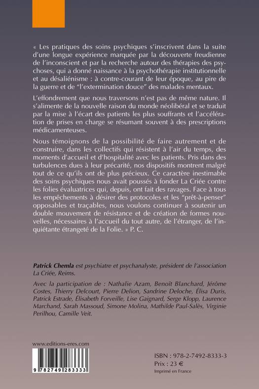 Nous témoignons de la possibilité de faire autrement et de construire, dans les collectifs qui résistent à l'air du temps, des moments d'accueil et d'hospitalité avec les patients. Pris dans des turbulences dues à leur précarité, nos dispositifs montrent malgré tout de ce qu'ils ont de plus précieux. Ce caractère inestimable des soins psychiques nous avait poussés à fonder La Criée contre les folies évaluatrices qui, depuis, ont fait des ravages. Face à tous les empêchements à désirer des protocoles et les « prêt-à-penser » opposables et traçables, nous voulons continuer à soutenir un double mouvement de résistance et de création de formes nouvelles, nécessaires à l'accueil du tout autre, de l'étranger, de l'inquiétante étrangeté de la Folie. »