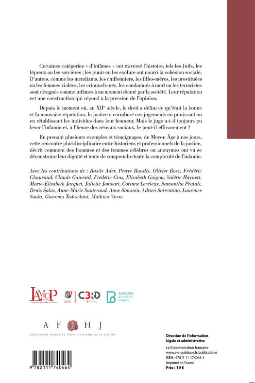 L'infamie est un jugement sur la « fama », la réputation des hommes ou des femmes, construit par le regard de la société et régulé par la justice à partir du XIIème siècle. Certaines catégories « d'infâmes » ont traversé l'histoire, tels les Juifs, les lépreux, les sorcières, d'autres comme les mendiants, les filles-mères, les prostituées ou femmes violées, les criminels-nés, les terroristes dépendent davantage de l'évolution de la société. Les punir ou les exclure nourrit la cohésion sociale. Le droit devrait rétablir l'individu dans son honneur. Face à la pression de l'opinion, le juge peut-il efficacement laver l'infamie, n'en est-il pas souvent prisonnier, voire l'auteur ?