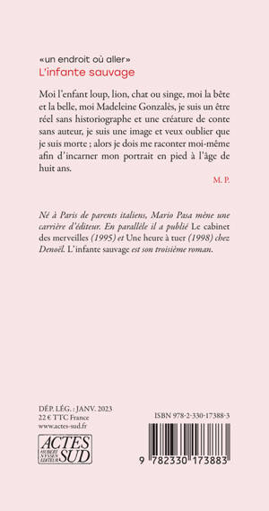 Moi l'enfant loup, lion, chat ou singe, moi la bête et la belle, moi Madeleine Gonzalès, je suis un être réel sans historiographe et une créature de conte sans auteur, je suis une image et veux oublier que je suis morte ; alors je dois me raconter moi-même afin d'incarner mon portrait en pied à l'âge de huit ans.