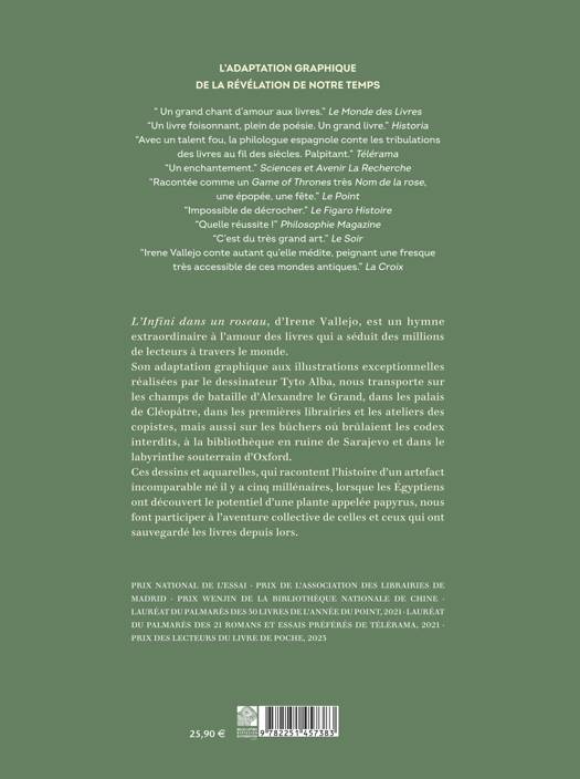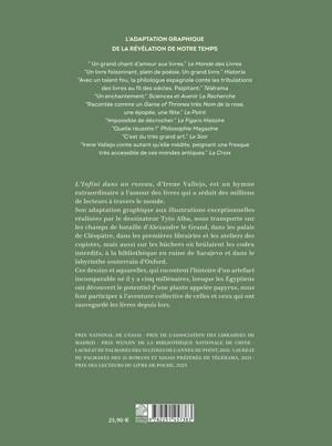 Son adaptation graphique aux illustrations exceptionnelles réalisées par le dessinateur Tyto Alba, nous transporte sur les champs de bataille d’Alexandre le Grand, dans les palais de Cléopâtre, dans les premières librairies et les ateliers des copistes, mais aussi sur les bûchers où brûlaient les codex interdits, à la bibliothèque en ruine de Sarajevo et dans le labyrinthe souterrain d’Oxford.