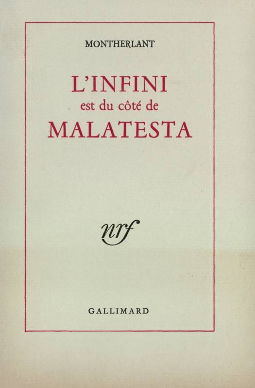 "Malatesta cherche très consciemment à mettre l'infini de son côté", dit Montherlant. Son héros n'a pas seulement vécu son présent. Il s'est préoccupé sans cesse de sa gloire : il l'a bâtie de ses exploits, de sa politique, de son amour pour Isotta, des monuments qu'il a laissés. On ne trouvera pas seulement dans ce livre des réflexions de Montherlant sur sa pièce Malatesta, mais aussi et surtout des considérations sur le vrai Malatesta, sur Sigismond Pandolphe, que l'Église accusa d'assassinats, de viol de cadavre, de torture et d'inceste, et qui fut une des figures les plus passionnantes de la Renaissance italienne. Homme excessif, vivant avec démesure, sentant avec violence, sujet à des crises de larmes et à des résolutions de fer, Malatesta offre le plus admirable exemple d'Italien qu'on puisse trouver. Stendhal se plaint en vingt endroits que les Français sont incapables de comprendre ces caractères-là, qui brûlent la vie à toute vitesse et - consciemment ou non - ne se préoccupent que de l'Infini, - c'est aussi l'avis de Montherlant.