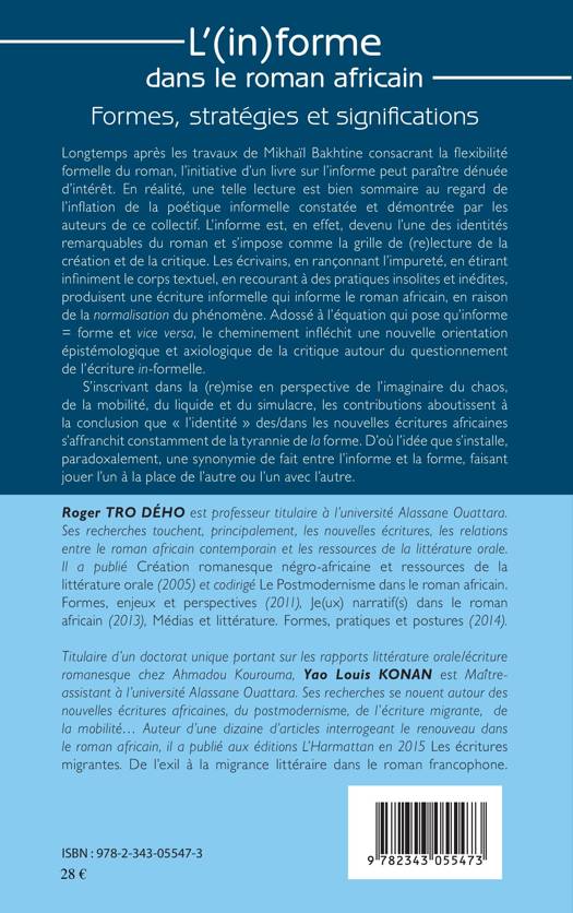 L'informe est devenu l'une des identités remarquables du roman et s'impose comme la grille de (re)lecture de la création et de la critique. Les écrivains, en rançonnant l'impureté, en étirant infiniment le corps textuel, en recourant à des pratiques insolites et inédites, produisent une écriture informelle qui informe le roman africain, en raison de la normalisation du phénomène. L'identité des/dans les nouvelles africaines s'affranchit constamment de la tyrannie de la forme. Paradoxalement, une synonymie de fait entre la forme et l'informe s'installe.