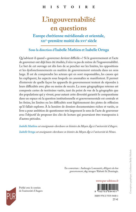 Qu’advient-il quand « gouverner devient difficile » ? Si le gouvernement et l’acte de gouverner ont déjà bien été étudiés, il n’en va pas de même de l’ingouvernabilité. Le but de cet ouvrage est dès lors de se pencher sur les limites, les oppositions et les dysfonctionnements en matière de gouvernement entendu dans un sens large. Il est de comprendre les acteurs qui en sont responsables, les causes qui les expliquent, les aspects sous lesquels ces anomalies se manifestent. Il permet d’entrevoir de quelle façon les appareils de gouvernement tentent de répondre à leurs difficultés avec plus ou moins de succès. La zone géographique retenue est composée certes de territoires variés, tant du point de vue de la géographie que des populations qui y vivent, pour autant cette diversité garantit le comparatisme dans un espace où la question institutionnelle et gouvernementale est centrale et les freins, les limites ou les difficultés sont légitimement des pistes de réflexion qu’il fallait explorer. À la lumière de dossiers documentaires riches et variés, ce livre a pour ambition de questionner très largement le sens de l’acte de gouverner avec l’objectif de proposer des clés de lecture qui pourraient être transposées à d’autres périodes.