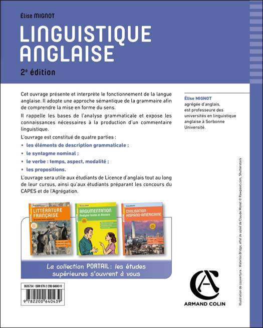 Cet ouvrage présente et interprète le fonctionnement de la langue anglaise. Il adopte une approche sémantique de la grammaire afin de comprendre la mise en forme du sens. Il rappelle les bases de l’analyse grammaticale, et expose les connaissances nécessaires à la production d’un commentaire linguistique. L’ouvrage est constitué de quatre parties : - les éléments de description grammaticale ; - le syntagme nominal ; - le verbe : temps, aspect, modalité ; - les propositions. L’ouvrage sera utile aux étudiants de Licence d’anglais tout au long de leur cursus, ainsi qu’aux étudiants préparant les concours du CAPES et de l’Agrégation.