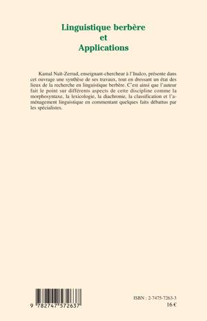 Kamal Naït-Zerrad, enseignant-chercheur à l'Inalco, présente dans cet ouvrage une synthèse de ses travaux, tout en dressant un état des lieux de la recherche en linguistique berbère. C'est ainsi que l'auteur fait le point sur les différents aspects de cette discipline comme la morphosyntaxe, la lexicologie, la diachronie, la classification et l'aménagement linguistique.