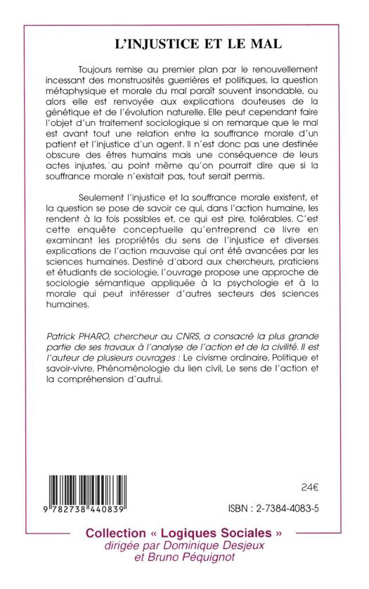 La question métaphysique et morale du mal fait ici l'objet d'un traitement sociologique. En effet le mal est avant tout une relation entre la souffrance morale d'un patient et l'injustice d'un agent. Il n'est donc pas une destinée obscure des êtres humains mais une conséquence de leurs actes injustes, au point même qu'on pourrait dire que si la souffrance morale n'existait pas, tout serait permis.