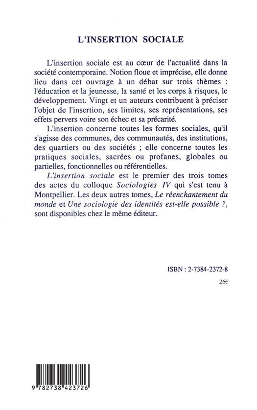L’insertion sociale est au cœur de l’actualité dans la société contemporaine. Notion floue et imprécise, elle donne lieu dans cet ouvrage à un débat sur trois thèmes : l’éducation et la jeunesse, la santé et les corps à risques, le développement. Vingt et un auteur contribuent à préciser l’objet de l’insertion, ses limites, ses représentations, ses effets pervers voire son échec et sa précarité.