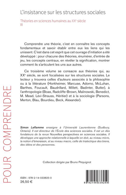 Comprendre une théorie, c'est en connaître les concepts fondamentaux et savoir établir entre eux les liens qui les unissent. C'est dans cet esprit que cet ouvrage d'initiation a été développé : pour chacune des théories, énumérer, d'entrée de jeu, les concepts centraux, en révéler la signification, montrer comment ils s'articulent les uns aux autres. Ce troisième volume se consacre aux théories qui, au XXe siècle, se sont focalisées sur les structures sociales. Le lecteur y trouvera celles d'auteurs associés à la philosophie ou à la littérature (Horkheimer, Marcuse, Adorno, McLuhan, Barthes, Foucault, Baudrillard, Millett, Badinter, Butler), à l'anthropologie (Boas, Radcliffe-Brown, Malinowski, Benedict, M. Mead, Lévi-Strauss, Héritier) et à la sociologie (Parsons, Merton, Blau, Bourdieu, Beck, Alexander).