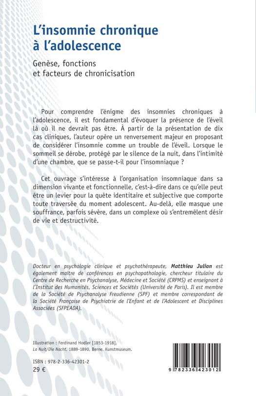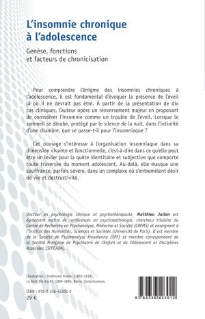 Pour comprendre l'énigme des insomnies chroniques à l'adolescence, il est fondamental d'évoquer la présence de l'éveil là où il ne devrait pas être. À partir de la présentation de dix cas cliniques, l'auteur opère un renversement majeur en proposant de considérer l'insomnie comme un trouble de l'éveil. Lorsque le sommeil se dérobe, protégé par le silence de la nuit, dans l'intimité d'une chambre, que se passe-t-il pour l'insomniaque ? Cet ouvrage s'intéresse à l'organisation insomniaque dans sa dimension vivante et fonctionnelle, c'est-à-dire dans ce qu'elle peut être un levier pour la quête identitaire et subjective que comporte toute traversée du moment adolescent. Au-delà, elle masque une souffrance, parfois sévère, dans un complexe où s'entremêlent désir de vie et destructivité.