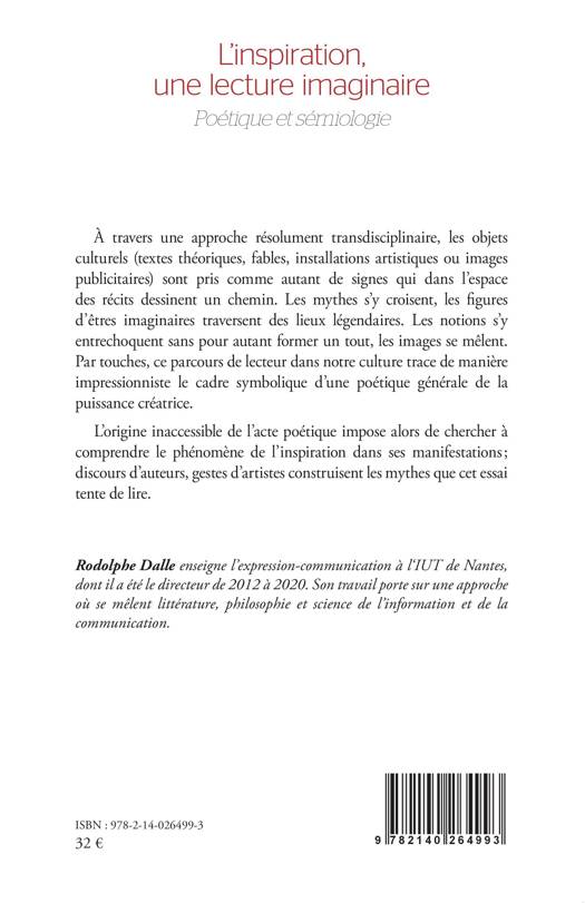 À travers une approche résolument transdisciplinaire, les objets culturels (textes théoriques, fables, installations artistiques ou images publicitaires) sont pris comme autant de signes qui dans l'espace des récits dessinent un chemin. Les mythes s'y croisent, les figures d'êtres imaginaires traversent des lieux légendaires. Les notions s'y entrechoquent sans pour autant former un tout, les images se mêlent. Par touches, ce parcours de lecteur dans notre culture trace de manière impressionniste le cadre symbolique d'une poétique générale de la puissance créatrice. L'origine inaccessible de l'acte poétique impose alors de chercher à comprendre le phénomène de l'inspiration dans ses manifestations.