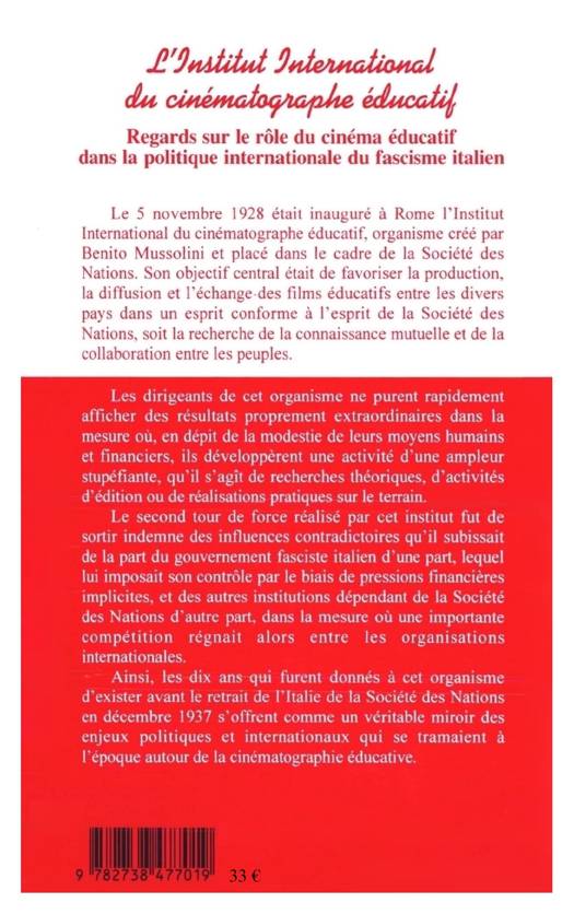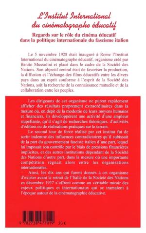 Le 5 novembre 1928 était inauguré à Rome l'Institut International du cinématographe éducatif, organisme créé par Benito Mussolini et placé dans le cadre de la Société des Nations. Son objectif central était de favoriser la production, la diffusion et l'échange des films éducatifs. Ainsi , les dix ans qui furent donnés à cet organisme d'exister avant le retrait de l'Italie de la Société des Nations en décembre 1937 s'offrent comme un véritable miroir des enjeux politiques et internationaux qui se tramaient à l'époque autour de la cinématographie éducative.