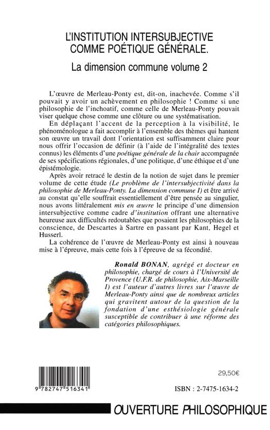 Dans ce deuxième volume, l'auteur met en œuvre le principe d'une dimension intersubjective comme cadre d'institution offrant une alternative heureuse aux difficultés redoutables que posaient les philosophies de la conscience, de Descartes à Sartre en passant par Kant, Hegel et Husserl. La cohérence de l'œuvre de Merleau-Ponty est ainsi à nouveau mise à l'épreuve, mais cette fois à l'épreuve de sa fécondité.