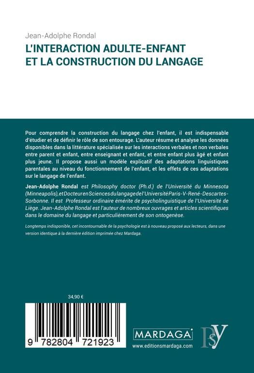 Pour comprendre la construction du langage chez l'enfant, il est indispensable d'étudier et de définir le rôle de son entourage. L'auteur résume et analyse les données disponibles dans la littérature spécialisée sur les interactions verbales et non verbales entre parent et enfant, entre enseignant et enfant, et entre enfant plus âgé et enfant plus jeune. Il propose aussi un modèle explicatif des adaptations linguistiques parentales au niveau du fonctionnement de l'enfant, et les effets de ces adaptations sur le langage de l'enfant. Jean-Adolphe Rondal est Philosophy doctor (Ph.d.) de l'Université du Minnesota (Minneapolis), et Docteur en Sciences du langage de l'Université Paris-V-René-Descartes-Sorbonne. Il est Professeur ordinaire émérite de psycholinguistique de l'Université de Liège. Jean-Adolphe Rondal est l'auteur de nombreux ouvrages et articles scientifiques dans le domaine du langage et particulièrement de son ontogenèse.