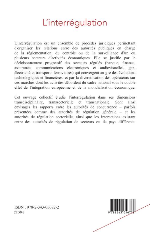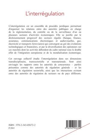 L'interrégulation est un ensemble de procédés juridiques permettant d'organiser les relations entre des autorités publiques en charge de la réglementation, du contrôle ou de la surveillance des secteurs d'activités économiques. Cet ouvrage collectif l'étudie dans ses dimensions transdisciplinaire, transectorielle et transnationale. Sont ainsi envisagés les rapports entre les autorités de concurrence et les autorités de régulation sectorielle, ainsi que les interactions entre les autorités de régulation de secteurs ou de pays différents.