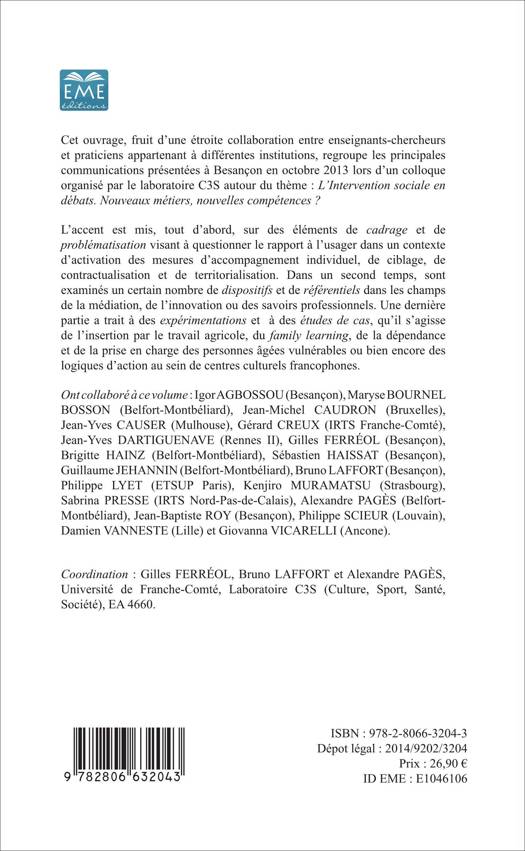 Cet ouvrage, fruit d'une étroite collaboration entre enseignants-chercheurs et praticiens appartenant à différentes institutions, regroupe les principales communications présentées à Besançon en octobre 2013 lors d'un colloque organisé par le laboratoire C3S autour du thème : L'Intervention sociale en débats. Nouveaux métiers, nouvelles compétences ? L'accent est mis, tout d'abord, sur des éléments de cadrage et de problématisation visant à questionner le rapport à l'usager dans un contexte d'activation des mesures d'accompagnement individuel...