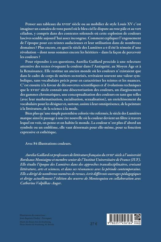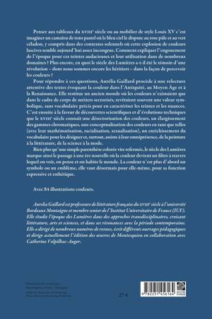 Pour répondre à ces questions, Aurélia Gaillard procède à une relecture attentive des textes évoquant la couleur dans l’Antiquité, au Moyen Âge et à la Renaissance. Elle restitue un ancien monde où les couleurs n’existaient que dans le cadre de corps de métiers sectorisés, revêtaient souvent une valeur symbolique, sans vocabulaire précis pour en caractériser les teintes et les nuances. C’est ensuite à la faveur de découvertes scientifiques et d’évolutions techniques que le XVIIIe siècle connaît une désectorisation des couleurs, un élargissement des gammes chromatiques, une conceptualisation des couleurs en tant que telles (avec leur mathématisation, racialisation, sexualisation), un enrichissement du vocabulaire pour les désigner et, surtout, assiste à leur omniprésence, de la peinture à la littérature, de la science à la mode.