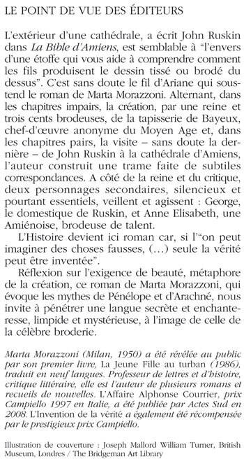 L'extérieur d'une cathédrale, a écrit John Ruskin dans La Bible d'Amiens, est semblable à "l'envers d'une étoffe qui vous aide à comprendre comment les fils produisent le dessin tissé ou brodé du dessus". C'est sans doute le fil d'Ariane qui soustend le roman de Marta Morazzoni. Alternant, dans les chapitres impairs, la création, par une reine et trois cents brodeuses, de la tapisserie de Bayeux, chef-d'oeuvre anonyme du Moyen Age et, dans les chapitres pairs, la visite - sans doute la dernière - de John Ruskin à la cathédrale d'Amiens, l'auteur construit une trame faite de subtiles correspondances. A côté de la reine et du critique, deux personnages secondaires, silencieux et pourtant essentiels, veillent et agissent : George, le domestique de Ruskin, et Anne Elisabeth, une Amiénoise, brodeuse de talent. L'Histoire devient ici roman car, si l'on peut imaginer des choses fausses, (...) seule la vérité peut être inventée". Réflexion sur l'exigence de beauté, métaphore de la création, ce roman de Marta Morazzoni, qui évoque les mythes de Pénélope et d'Arachné, nous invite à pénétrer une langue secrète et enchanteresse, limpide et mystérieuse, à l'image de celle de la célèbre broderie. « Marta Morazzoni (Milan, 1950) a été révélée au public par son premier livre, La Jeune Fille au turban (1986), traduit en neuf langues. Professeur de lettres et d'histoire, critique littéraire, elle est l'auteur de plusieurs romans et recueils de nouvelles. »L'Affaire Alphonse Courrier«, prix Campiello 1997 en Italie, a été publiée par Actes Sud en 2008.» L'Invention de la vérité« a également été récompensée par le prestigieux prix Campiello.»