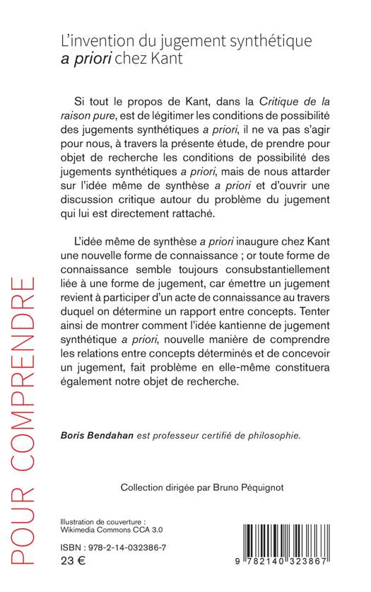 Si tout le propos de Kant, dans la Critique de la raison pure, est de légitimer les conditions de possibilité des jugements synthétiques a priori, il ne va pas s'agir pour nous, à travers la présente étude, de prendre pour objet de recherche les conditions de possibilité des jugements synthétiques a priori, mais de nous attarder sur l'idée même de synthèse a priori et d'ouvrir une discussion critique autour du problème du jugement qui lui est directement rattaché. L'idée même de synthèse a priori inaugure chez Kant une nouvelle forme de connaissance; or toute forme de connaissance semble toujours consubstantiellement liée à une forme de jugement, car émettre un jugement revient à participer d'un acte de connaissance au travers duquel on détermine un rapport entre concepts. Tenter ainsi de montrer comment l'idée kantienne de jugement synthétique a priori, nouvelle manière de comprendre les relations entre concepts déterminés et de concevoir un jugement, fait problème en elle-même constituera également notre objet de recherche.