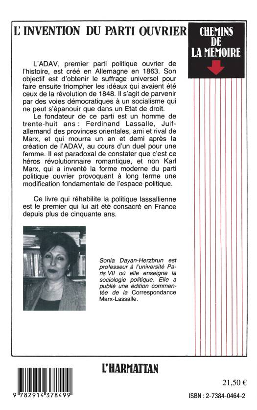 L'ADAV, premier parti politique ouvrier de l'histoire, est créé en Allemagne en 1863. Son objectif est d'obtenir le suffrage universel pour faire ensuite triompher les idéaux qui avaient été ceux de la révolution de 1848. Il s'agit de parvenir par des voies démocratiques à un socialisme qui ne peut s'épanouir que dans un Etat de droit. Le fondateur de ce parti est un homme de trente-huit ans : Ferdinand Lassalle, Juif-allemand des provinces orientales, ami et rival de Marx, et qui mourra un an et demi après la création de l'ADAV, au cours d'un duel pour une femme. Il est paradoxal de constater que c'est ce héros révolutionnaire romantique, et non Karl Marx, qui a inventé la forme moderne du parti politique ouvrier provoquant à long terme une modification fondamentale de l'espace politique. Ce livre qui réhabilite la politique lassallienne est le premier qui lui ait été consacré en France depuis plus de cinquante ans.