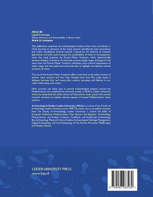 This study opens a dialogue between first and twenty-first century successes and failures in our urban relationship with water. This publication examines the archaeological evidence from three city blocks in Ostia, focusing on elements of the water systems identified by past excavations and within unpublished archival material. Inspired by the diversity of research approaches currently used to assess the sustainability of water in contemporary cities, this study presents the Roman Water Footprint, which diachronically assesses changes to all parts of a hydraulic system (supply, usage, drainage). At the same time, the Roman Water Footprint calculates socio-cultural expressions of water usage, and uses paleo-environmental data to highlight the dynamic natural presence of water. The use of the Roman Water Footprint offers a new look at the wider context of ancient water systems and how they changed over time. This study opens a dialogue between first and twenty-first century successes and failures in our urban relationship with water.