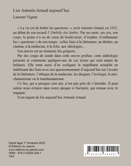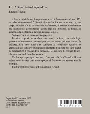 « La vie est de brûler les questions. », écrit Antonin Artaud, en 1925. Par ses mots, ses cris, son corps, le poète n’a eu de cesse de bouleverser, d’irradier, d’enflammer les « questions » de son temps : celles liées à la littérature, au théâtre, au cinéma, à la médecine, à la folie, aux idéologies... Par des coups de sonde dans son œuvre profuse, cette anthologie présente et commente quelques-uns de ces textes qui sont autant de brûlures. Elle tente aussi d’en souligner la stupéfiante actualité en établissant des liens avec nos questionnements d’aujourd’hui sur l’avenir de la littérature, l’éthique de la médecine, les drogues, l’écologie, le néo-chamanisme ou le transhumanisme. Ce feu, qui a presque cent ans, n’est pas près de s’éteindre. Il peut même nous éclairer dans notre époque si fracturée, qui renoue avec le tragique. Il est urgent de lire aujourd’hui Antonin Artaud.