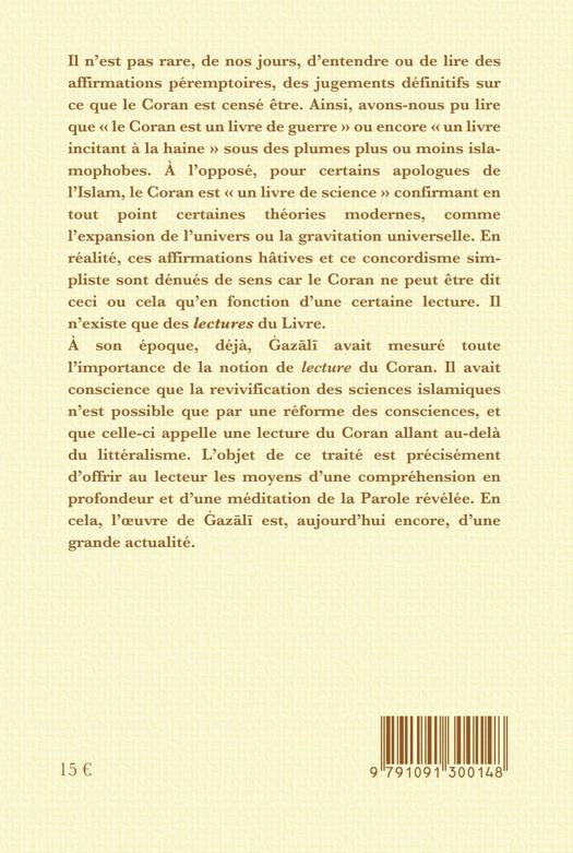 Il n’est pas rare, de nos jours, d’entendre ou de lire des affirmations péremptoires, des jugements définitifs sur ce que le Coran est censé être. Ainsi, avons-nous pu lire que « le Coran est un livre de guerre » ou encore « un livre incitant à la haine » sous des plumes plus ou moins islamophobes. À l’opposé, pour certains apologues de l’Islam, le Coran est « un livre de science » confirmant en tout point certaines théories modernes, comme l’expansion de l’univers ou la gravitation universelle. En réalité, ces affirmations hâtives et ce concordisme simpliste sont dénués de sens car le Coran ne peut être dit ceci ou cela qu’en fonction d’une certaine lecture. Il n’existe que des lectures du Livre. À son époque, déjà, Ghazâlî avait mesuré toute l’importance de la notion de lecture du Coran. Il avait conscience que la revivification des sciences islamiques n’est possible que par une réforme des consciences, et que celle-ci appelle une lecture du Coran allant au-delà du littéralisme. L’objet de ce traité est précisément d’offrir au lecteur les moyens d’une compréhension en profondeur et d’une méditation de la Parole révélée. En cela, l’œuvre de Ghazâlî est, aujourd’hui encore, d’une grande actualité.