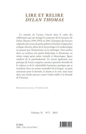 Ce numéro de Cycnos s'inscrit dans le cadre des célébrations qui ont marqué le centenaire de la naissance de Dylan Thomas (1914-1953) en 2014. Il propose des lectures originales des textes du poète gallois à la lumière d'approches critiques diverses allant de la sociocritique à la traductologie en passant par l'historicisme ou la stylistique. Font surface dans ces analyses une poésie dialectique, dissonante, et de l'excès, en même temps qu'un poète versatile, figure de la postmodernité.