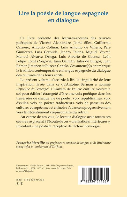 Ce livre présente des lectures-écoutes des oeuvres poétiques de Vicente Aleixandre, Jaime Siles, Guillermo Carnero, Antonio Colinas, Luis Antonio de Villena, Pere Gimferrer, Luis Cernuda, Jenaro Talens, Miguel Veyrat, Manuel Álvarez Ortega, Luis Alberto de Cuenca, León Felipe, Tomás Segovia, Juan Gelmán, Julia de Burgos, Juan Ramón Jiménez et Pureza Canelo. Ces auteur(e)s ont marqué la tradition contemporaine en langue espagnole du dialogue des cultures dans leurs écrits. Le présent volume s'accorde à lire la singularité de leur inspiration livrée dans ce qu'Antoine Berman a nommé L'épreuve de l'étranger. L'univers de l'autre culture s'ouvre à soi pour édifier l'étrangeté d'être une voix poétique dans les traversées de chaque vie de poète: voix républicaines, voix d'exilés, voix de poètes traducteurs, voix de passeurs des cultures européennes et chinoise s'avancent progressivement vers le décentrement crépusculaire du retrait. Au centre de ces voix, le lecteur dialogue avec toutes ces oeuvres se plaçant à l'écoute de ces oralisations intérieures, inventant une posture réceptive de lecteur privilégié.