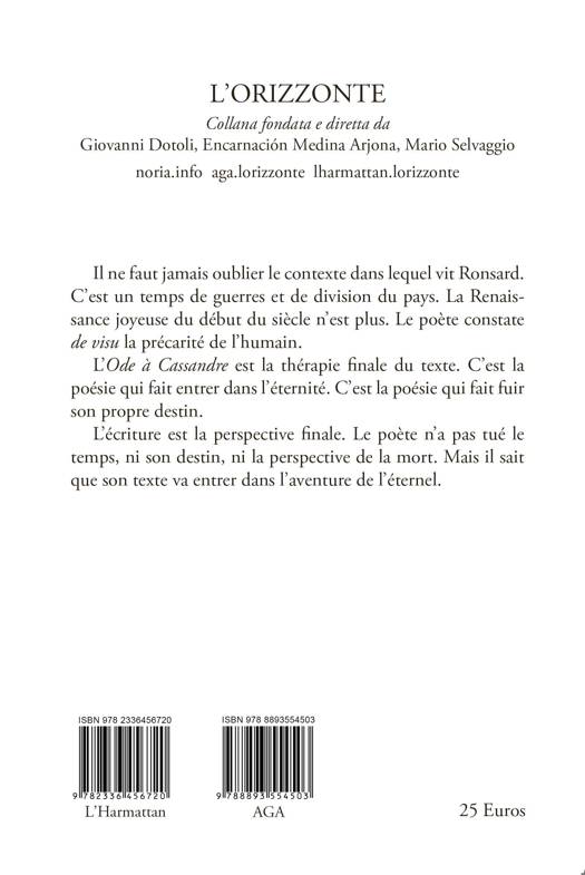 Ronsard chante la poésie plus que l’amour. Cassandre et les autres femmes qu’il aime et qu’il idéalise lui permettent de chanter la poésie, dans un « vers hautement grave », parfois dans un « style bas », « sans enflure ni fard, d’un mignard et doux style ». C’est le thème de l’amour pour Cassandre qui permet au poète d’aller au cœur de la poésie. C’est la poésie qui le sauve. En chantant l’amour, il chante l’immortalité de son art. Son memento mori est un hymne à la poésie. C’est la poésie qui éloigne la mort. L’amour pour la poésie dépasse l’amour pour la femme. Cassandre est accessible via la poésie. C’est la poésie qui échappe aux outrages du temps. Ronsard donne corps au texte par l’amour envers Cassandre. L’Ode à Cassandre est le concentré de la force de la poésie. En pleine Renaissance, Ronsard attribue à la poésie l’énergie de la vie. L’amour est une vertu, mais il peut l’être par l’énergie de la poésie salvatrice. Entre l’amour et la poésie, il y a un lien indissoluble. C’est la poésie qui donne à l’amour le centre du poème. Cassandre est la Muse et la poésie elle-même. Atteindre Cassandre est difficile comme il est difficile d’atteindre la poésie. L’Ode à Cassandre est une quête d’immortalité via la poésie, la seule qui puisse assurer un avenir. Il ne faut jamais oublier le contexte dans lequel vit Ronsard. C’est un temps de guerres et de division du pays. La Renaissance joyeuse du début du siècle n’est plus. Le poète constate de visu la précarité de l’humain. L’Ode à Cassandre est la thérapie finale du texte. C’est la poésie qui fait entrer dans l’éternité. C’est la poésie qui fait fuir son propre destin. L’écriture est la perspective finale. Le poète n’a pas tué le temps, ni son destin, ni la perspective de la mort. Mais il sait que son texte va entrer dans l’aventure de l’éternel.