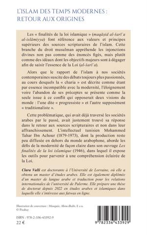Les finalités de la loi islamique (maqāṣid al-sarīʿa al-islāmiyya) font référence aux valeurs et principes supérieurs des sources scripturaires de l'islam. Alors que le rapport de l'islam à nos sociétés contemporaines suscite des débats toujours plus passionnés, l'éloignement voire l'abandon de ses préceptes se présente comme la seule issue à ce conflit qui opposerait deux visions du monde l'une dite progressiste et l'autre supposément traditionaliste . Cette problématique, qui avait déjà traversé les sociétés arabes par le passé, avait justement trouvé sa réponse dans le retour aux sources scripturaires et non dans leur affranchissement. L'intellectuel tunisien Mohammed Tahar Ibn Achour (1879-1973), dont la production reste peu diffusée en dehors du monde arabophone, aborde les défis de la modernité de façon claire dans son ouvrage Les finalités de la loi islamique (1946), dans lequel il expose les outils pour parvenir à une compréhension éclairée de la Loi.