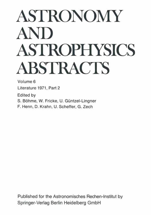 Astronomy and Astrophysics Abstracts, which has appeared in semi-annual volumes since 1969, is de- voted to the recording, summarizing and indexing of astronomical publications throughout the world. It is prepared under the auspices of the International Astronomical Union (according to a resolution adopted at the 14th General Assembly in 1970). Astronomy and Astrophysics Abstracts aims to present a comprehensive documentation of literature in all fields of astronomy and astrophysics. Every effort will be made to ensure that the average time interval between the date of receipt of the original literature and publication of the abstracts will not exceed eight months. This time interval is near to that achieved by monthly abstracting journals, com- pared to which our system of accumulating abstracts for about six months offers the advantage of greater convenience for the user. Volume 6 contains literature published in 1971 and received before March 15, 1972; some older liter- ature which was received late and which is not recorded in earlier volumes is also included.