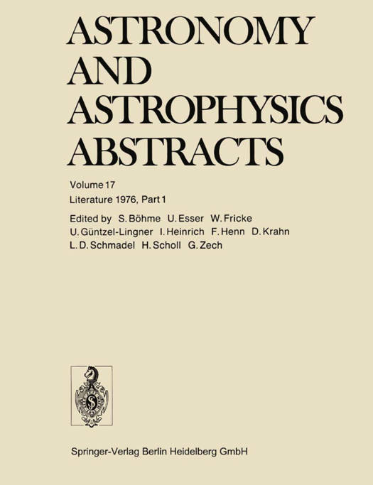 Astronomy and Astrophysics Abstracts, which has appeared in semi-annual volumes since 1969, is de- voted to the recording, summarizing and indexing of astronomical publications throughout the world. It is prepared under the auspices of the International Astronomical Union (according to a resolution adopted at the 14th General Assembly in 1970). Astronomy and Astrophysics Abstracts aims to present a comprehensive documentation of literature in all fields of astronomy and astrophysics. Every effort will be made to ensure that the averagetime interval between the date of receipt of the original literature and publication ofthe abstracts will not exceed eight months. This time interval is near to that achieved by monthly abstracting journals, com- pared to which our system of accumulating abstracts for about six months offers the advantage of greater convenience for the user. Volume 17 contains literature published in 1976 and received before August 15, 1976; some older literature which was received late and which is not recorded in earlier volumes is also included. We acknowledge with thanks contributions to this volume by Dr. J. Bouska, who surveyed journals and publications in the Czech languageand supplied us with abstracts in English, and by the Common- wealth Scientific and Industrial Research Organization (C.S.I.R.O.), Sydney, for providing titles and abstracts of papers on radio astronomy. We want to acknowledge valuable contributions to this vol- ume by Zentralstelle fur Atomkernenergie-Dokumentation, Leopoldshafen, which supported our ab- stracting service by sending us retrospective literature searches.