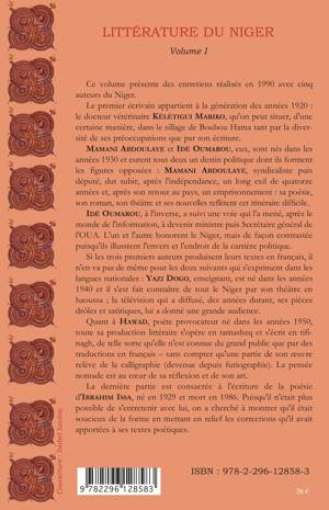 Ce volume présente des entretiens réalisés en 1990 avec cinq auteurs du Niger : Kélétigui Mariko, écrivain appartenant à la génération des années 20 qu'on peut situer dans le sillage de Boubou Hama, Mamani Abdoulaye et Idé Oumarou, nés dans les années 30 et qui eurent un destin politique en figure opposée; Yazi Dogo, né dans les années 40, s'est fait connaître par son théâtre en haoussa, Hawad, poète provocateur né dans les années 50 où la pensée nomade est au coeur de sa réflexion et enfin Ibrahim Issa poète né en 1929 et mort en 1986.
