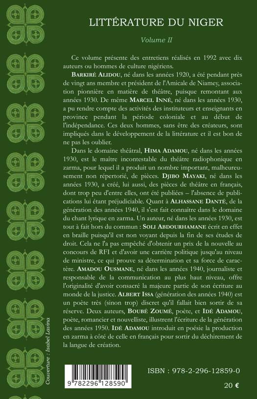 Ce volume présente des entretiens réalisés en 1992 avec dix auteurs ou hommes de culture nigériens: Barkiré Alidou, né dans les années 20, Marcel Inné, né dans les années 30 et qui eurent un rôle important dans le développement de la littérature. Dans le domaine du théâtre : Hima Adamou, né dans les années 30, maître incontestable du théâtre radiophonique, Djibo Mayaki et Alhassane Danté, génération des années 40, qui s'est fait connaître dans le domaine du chant lyrique en zarma, enfin Amadou Ousmane, Albert Issa, poète et enfin Boubé Zoumé et Idé Adamou, poètes, romancier et nouvelliste pour le dernier.