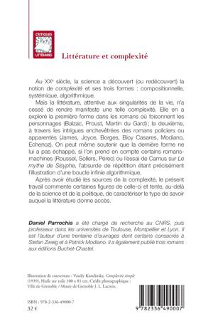 Au XXe siècle, la science a découvert (ou redécouvert) la notion de complexité et ses trois formes : compositionnelle, systémique, algorithmique. Mais la littérature, attentive aux singularités de la vie, n’a cessé de rendre manifeste une telle complexité. Elle en a exploré la première forme dans les romans où foisonnent les personnages (Balzac, Proust, Martin du Gard) ; la deuxième, à travers les intrigues enchevêtrées des romans policiers ou apparentés (James, Joyce, Borges, Bioy Casares, Modiano, Echenoz). On peut même soutenir que la dernière forme ne lui a pas échappé, si l’on prend en compte certains romans-machines (Roussel, Sollers, Pérec) ou l’essai de Camus sur Le mythe de Sisyphe, l’absurde de répétition étant précisément l’illustration d’une boucle infinie algorithmique. Après avoir étudié les sources de la complexité, le présent travail commente certaines figures de celle-ci et tente, au-delà de la science et de la politique, de caractériser le type de savoir auquel la littérature donne accès.