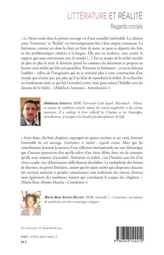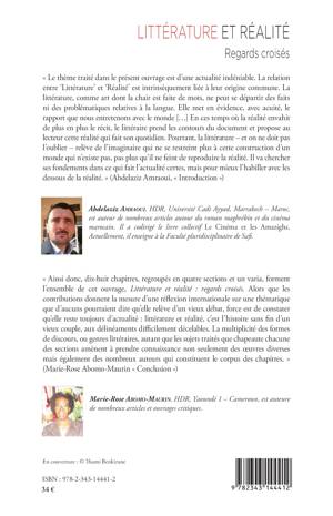 Le thème traité dans cet ouvrage est d'une actualité indéniable. La relation entre "Littérature" et "Réalité" est intrinsèquement liée à leur origine commune. En ces temps où la réalité envahit de plus en plus le récit, la littérature prend les contours du document et propose au lecteur cette réalité qui fait son quotidien. (Abdelaziz Amraoui, Introduction). La multiplicité des formes de discours, ou genre littéraires, autant que les sujets traités dans ce livre amènent à prendre connaissance non seulement des oeuvres diverses mais également des nombreux auteurs qui constituent le corpus des chapitres. (Marie-Rose Abomo-Maurin, Conclusion)