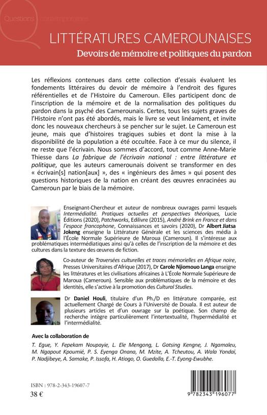 Les réflexions contenues dans cet essai évaluent les fondements littéraires du devoir de mémoire à l'endroit des figures référentielles et de l'Histoire du Cameroun. Elles participent donc de l'inscription de la mémoire et de la normalisation des politiques du pardon dans la psyché des Camerounais.